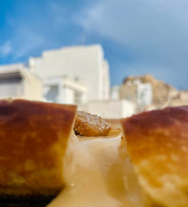 Base crujiente de galleta casera, machacada a mano, fundida con mantequilla de verdad que se rompe al tenedor. Encima, una crema densa y sedosa de queso fresco de la tierra, huevos de corral, azúcar moreno y el corazón del turrón de Jijona: almendra marcona tostada y miel pura, deshecha lentamente hasta integrarse en la masa como un abrazo dulce y almendrado. Batida con mimo para que quede sin grumos, horneada a fuego lento hasta que la superficie se tiñe de dorado y el interior tiembla apenas. Cada cucharada es Navidad anticipada: la cremosidad del queso se funde con el sabor profundo y aterciopelado del turrón, con puntitos de almendra que crujen y un final suave de miel que envuelve el paladar. ¡100% casera, 100% adictiva!